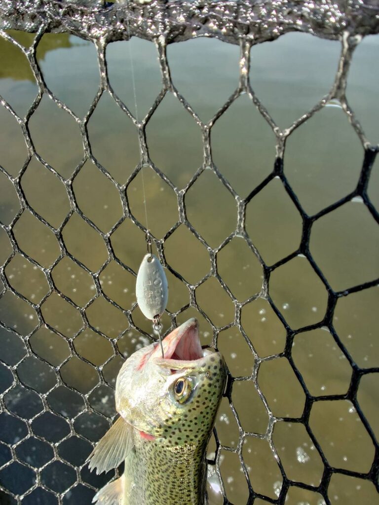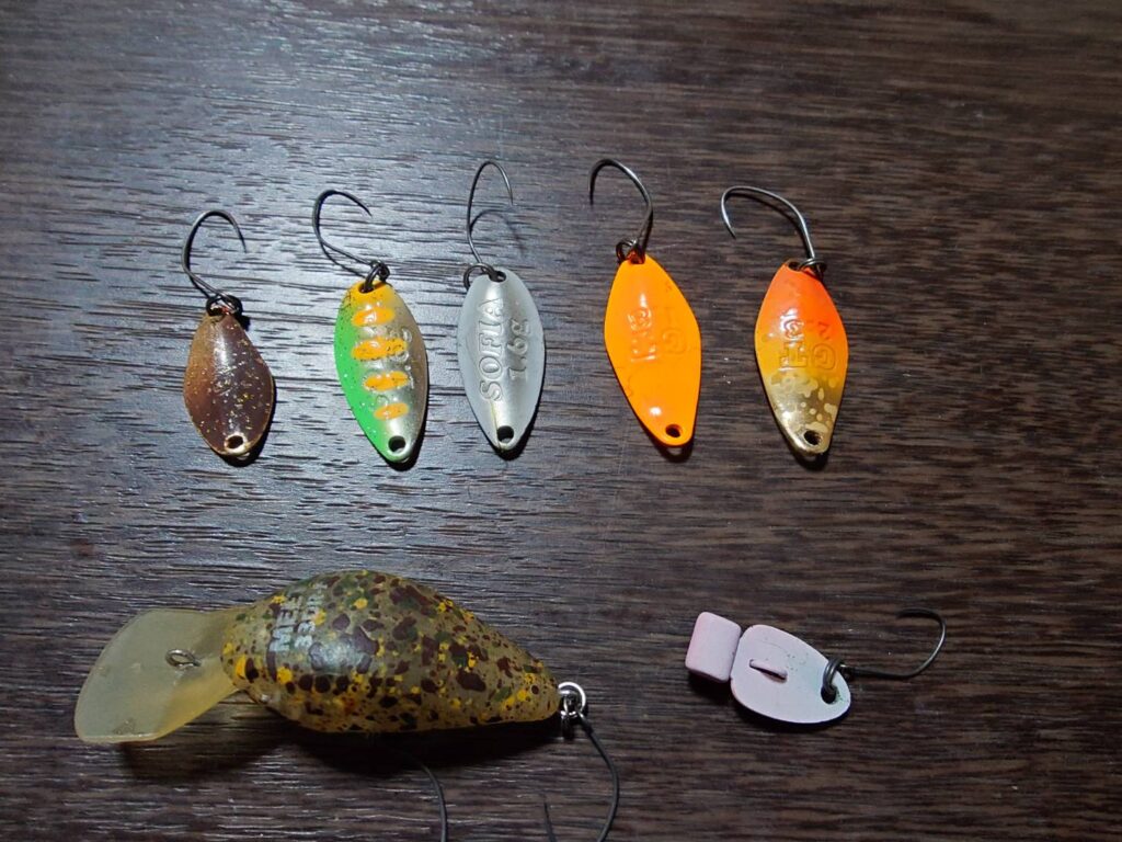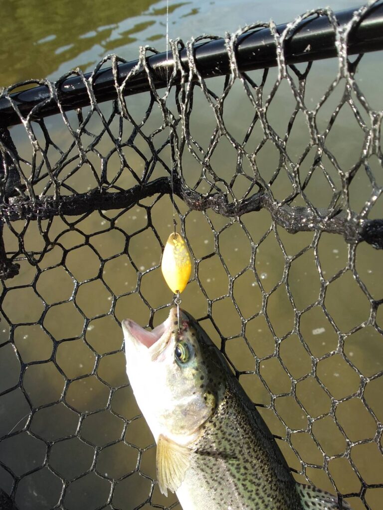 放流魚はグラトニー2.3gでやや早めのリトリーブで釣れました。午後の放流はスプーンは一緒ですがレンジを探しながら釣る感じでした。